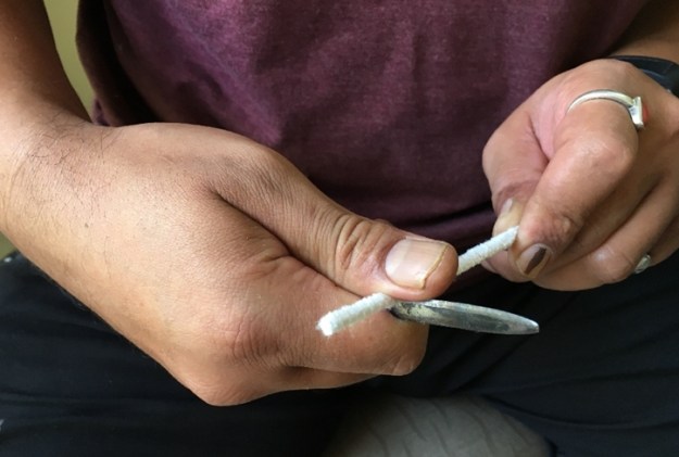 Jeff declares that the stem internals are now clean. After thinning a thick pipe cleaner with the pen knife, Paresh runs the pipe cleaner through the stem and bone tenon for one final pass.