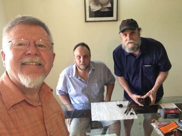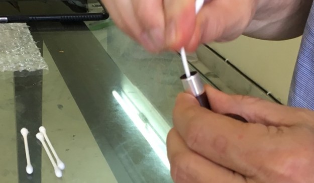 It’s true, we may have done this a bit out of order, but Jeff and Paresh team tag working on cleaning the internals of the mortise. Cotton buds and pipe cleaners are used, after dipping in alcohol. Paresh excavates some gunk with a small scoop tool which was part of his arsenal.