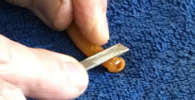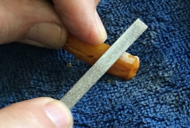 Meanwhile, after the first round of CA glue cures (it didn’t take long), Steve continues to work on the bit of the amber stem. He uses a file on the button and also files out a chip on the side of the stem, next to the button.
