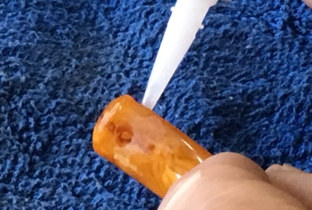 The amber stem bit has experienced chipping and this is next up for repair. Steve begins the repair by spot dropping clear CA glue to fill the divot. After applying, he puts the stem aside for the CA glue to cure.