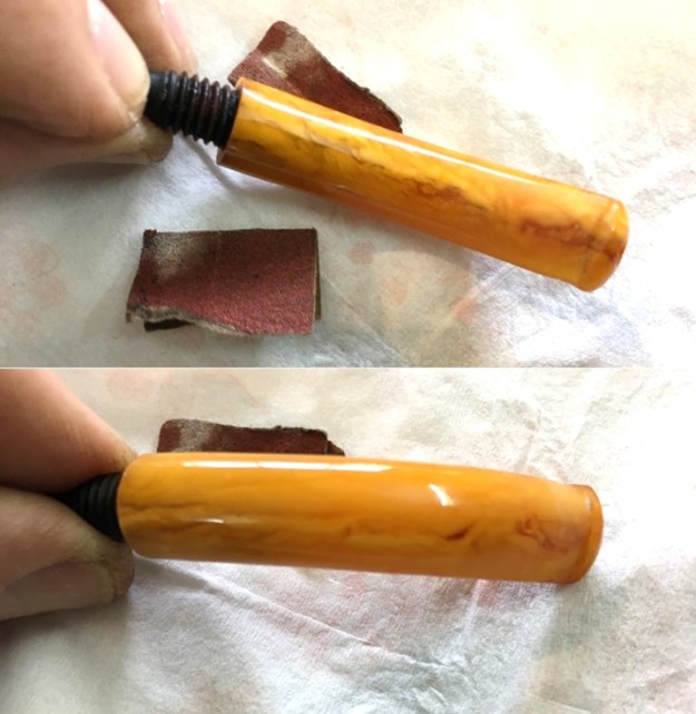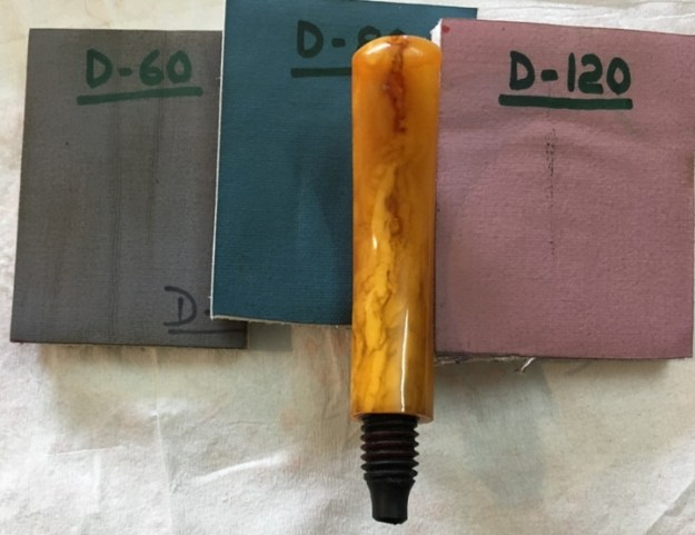 The amber stem is then treated to the full regimen of micromesh pads, dry sanding from 1500 to 12000.