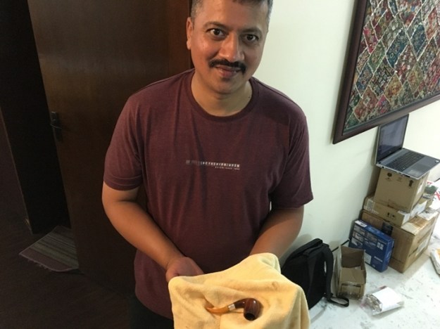 One of the highlights of our time in Pune was going through Paresh’s entire collection of pipes – from his grandfather as well as his own additions. During the hot(!) part of the Indian day, Paresh unwrapped each pipe to show and to pass around. To hold and examine these pipes was a treat. If this were not enough, we (Dal, Steve and Paresh – Jeff’s not a smoker just a collector and journeyman cleaner!) also smoked 3 very special pipes from Paresh’s grandfather that Paresh had restored – classic pipes with albatross bone shank extensions and horn stems. At the beginning of the convocation, we decided we would smoke these pipes together in celebration of the completion of our communal restoration project.