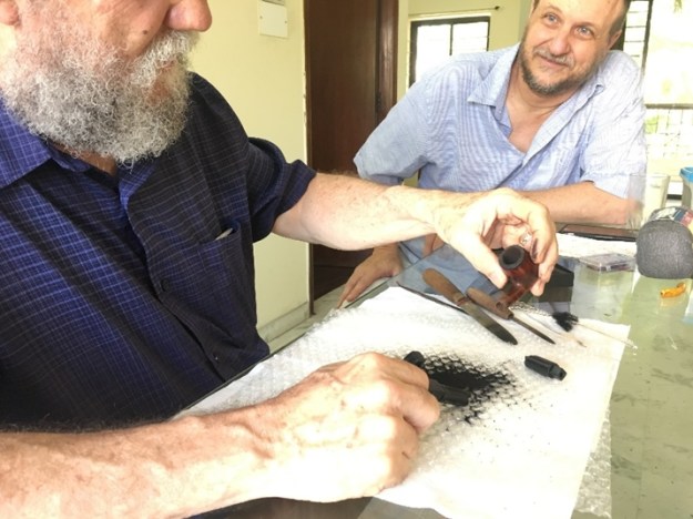 Paresh and Abha took me to the airport and I found myself surprisingly reflective and quiet as Paresh navigated the choked Pune streets heading to the airport – cars, scooters and Tuk Tuks (motorized rickshaw taxis) dodged here and there like swallows on wheels in a chaotic purposeful swarm. Only the day before I was helmeted on the back of Paresh’s classic 1980 ROYAL ENFIELD 535 CC motorcycle and videoed with my iPhone while Paresh became one with the swarm! Oh my…. As I sat in the back seat of the car on the way to the airport, Paresh asked me why I wasn’t smiling – that I was serious. It was true that navigating through the Pune Airport’s security was on my mind and wondering if they would remove my prized Savinelli pipe lighter, an unbelievable gift from my landlady, Rozie, in Sofia, left behind by her now departed husband. My concerns about the lighter fortunately, were proven to be unfounded, but I found myself reflecting on the past week under the watchful care and rich hospitality of Paresh and Abha. How do I describe it? How do I tell this story to capture not only the unbelievable pipe our special cohort restored together, but the bond that we discovered along the way?