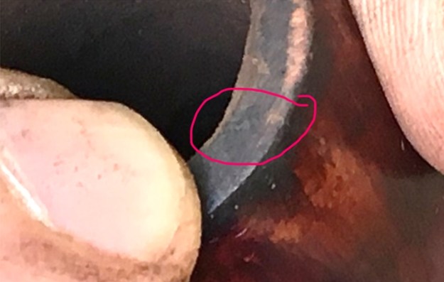 Steve’s fine sanding with the micromesh pad on the rim brings into focus two cracks, the original and a lesser one – in the picture below at the 4 o’clock and 6:30 o’clock positions.