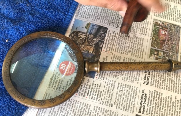The threads of the bone tenon have years of debris compacted and Jeff starts with a bristled brush to help clean and then passes the stem across the table and Paresh continues the delicate thread cleaning probing and scraping with the flat blade.