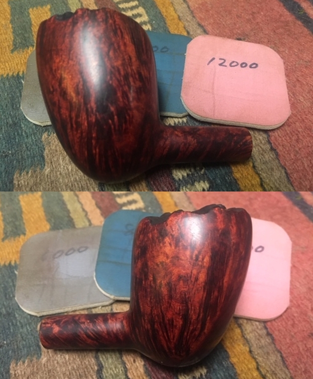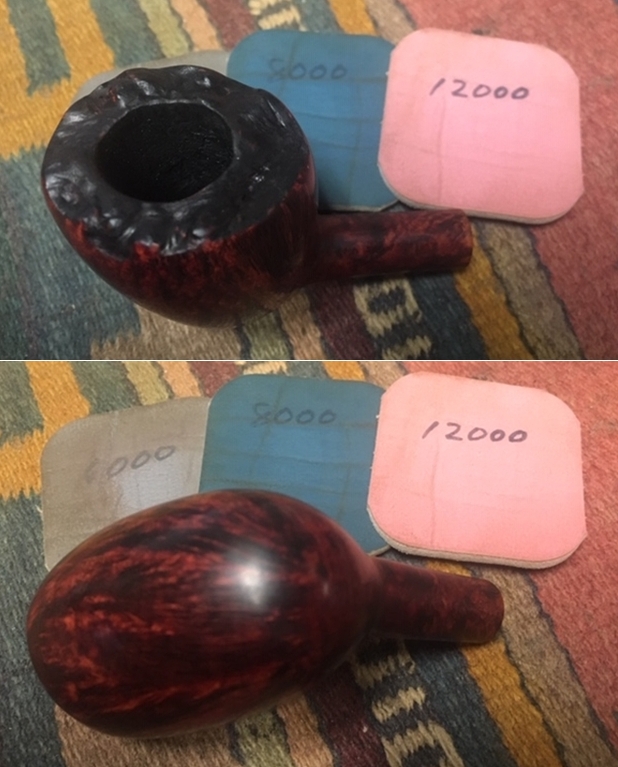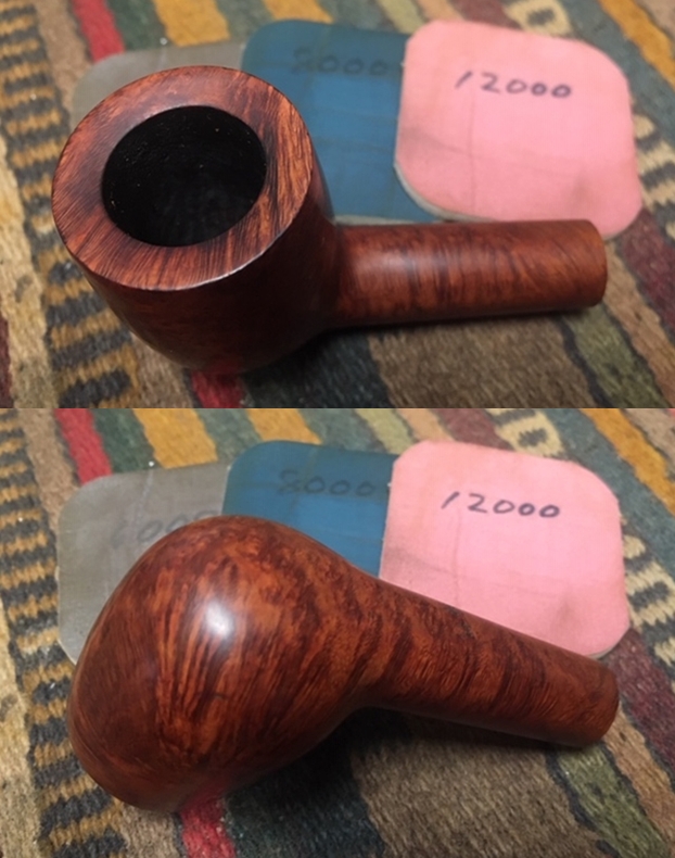 I polished the bowl and rim top with micromesh sanding pads – wetsanding it with 1500-12000 grit pads. I wiped the bowl down with a damp cloth after each pad to remove the sanding debris. The grain began to stand out. After the final sanding pad I hand buffed it with a cotton cloth to raise a shine.