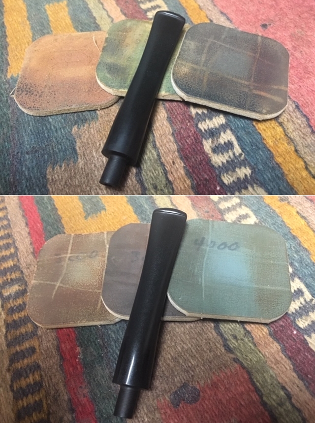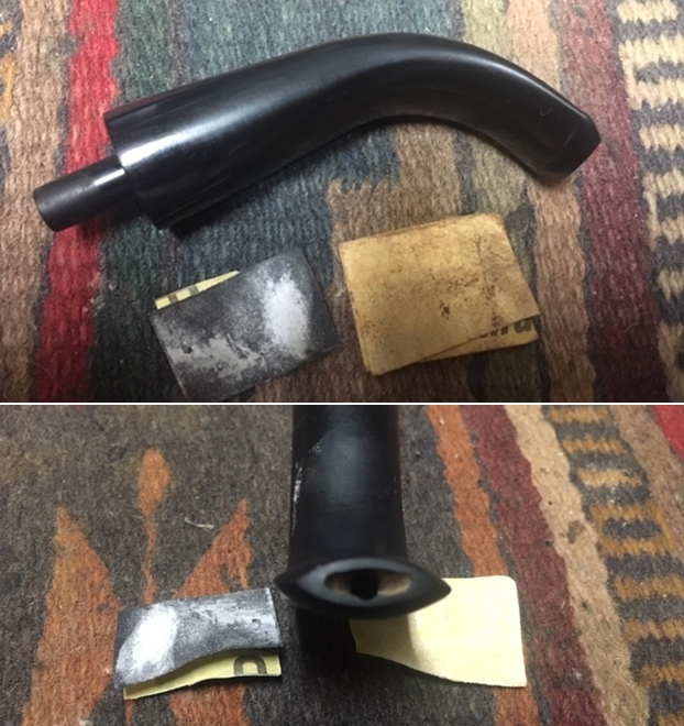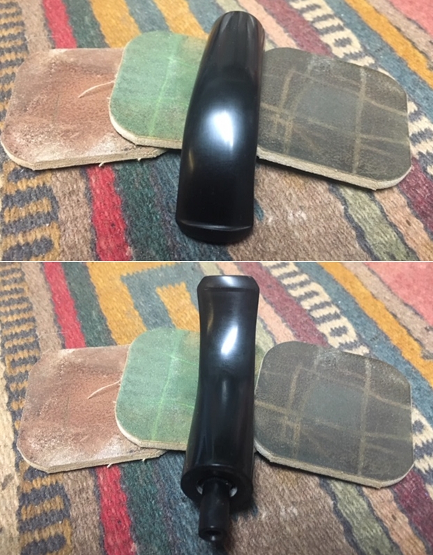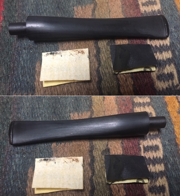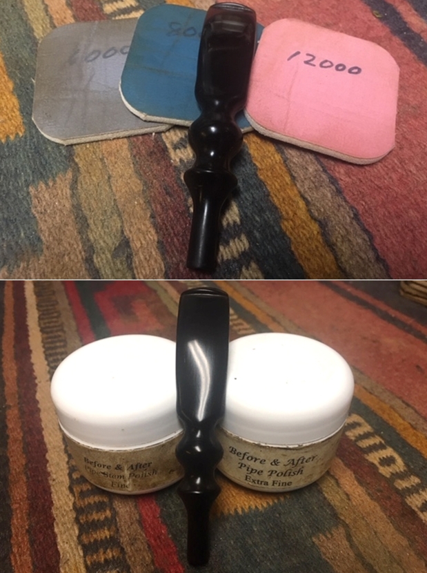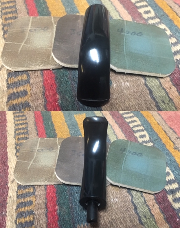 I sanded out the small tooth marks and chatter next to the button on both sides of the stem with a folded piece of 220 grit sandpaper. I sanded the stem with 400 grit wet dry sandpaper to remove the scratches. I polished it with Denicare Mouthpiece Polish to scrub out the scratches. I wiped it down with some Obsidian Oil and set it aside to dry.