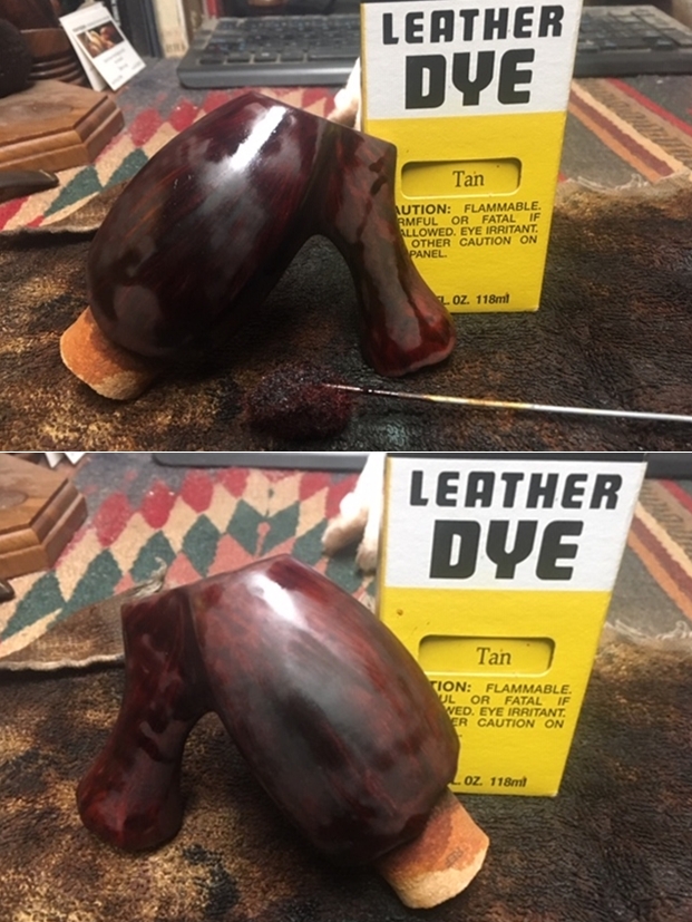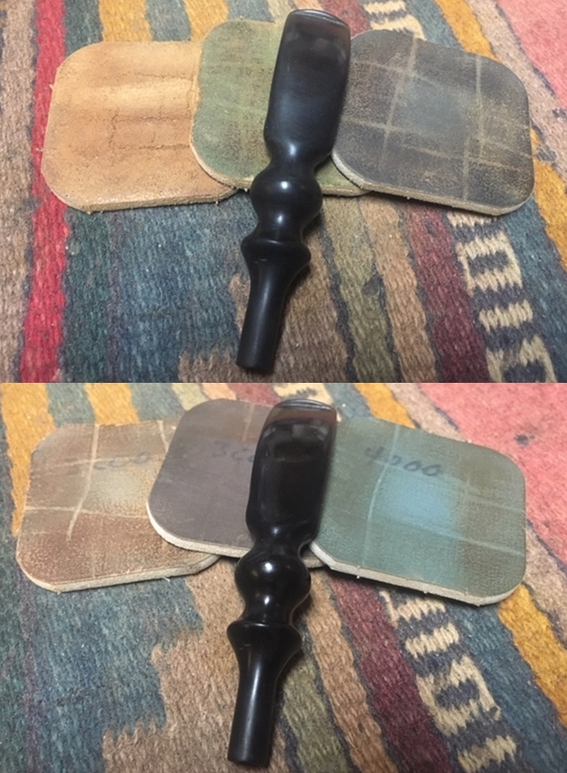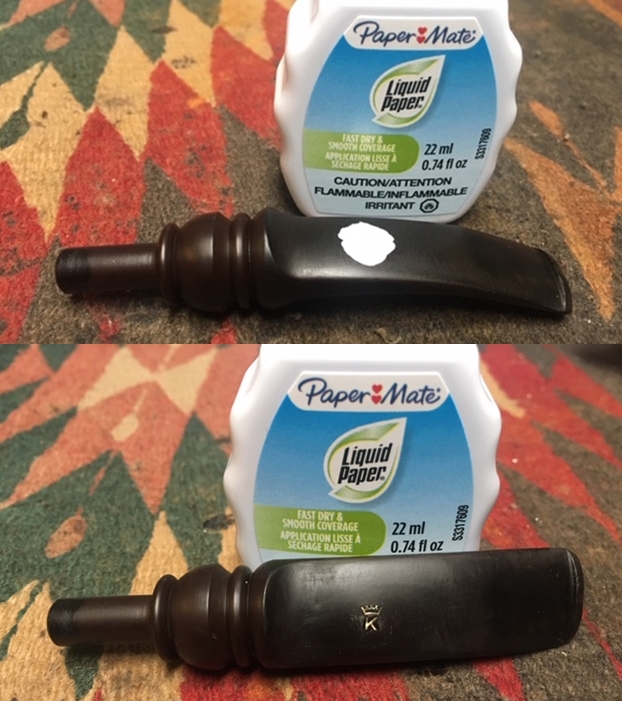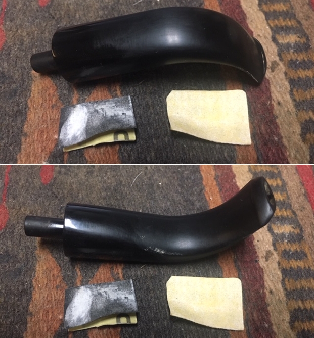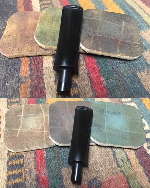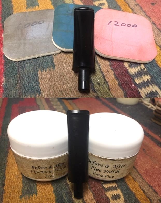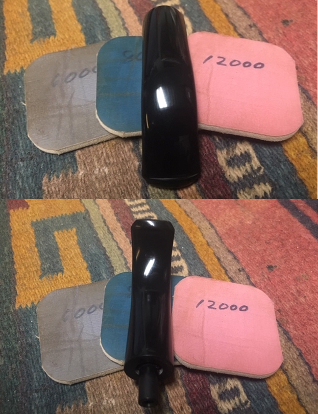 I sanded out the small tooth marks and chatter next to the button on both sides of the stem with a folded piece of 220 grit sandpaper. I sanded the stem with 400 grit wet dry sandpaper to remove the scratches. I polished it with Denicare Mouthpiece Polish to scrub out the scratches. I wiped it down with some Obsidian Oil and set it aside to dry.