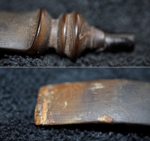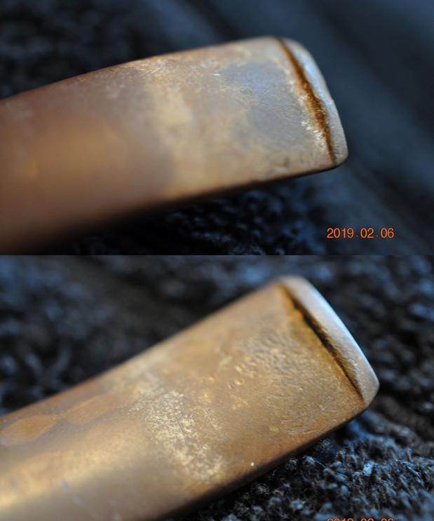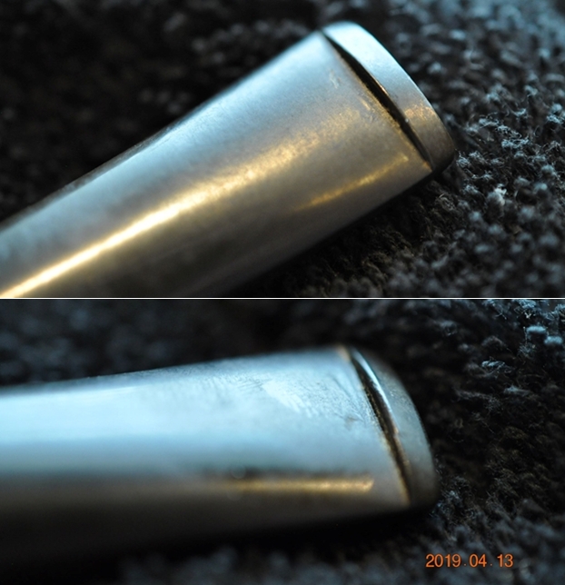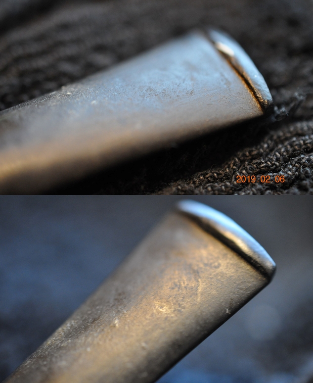 The next two photos show the stem surface. They show the calcification, oxidation and the chatter on both sides near the button. There are light tooth marks on the stem near the button. There is some wear on the button edge.