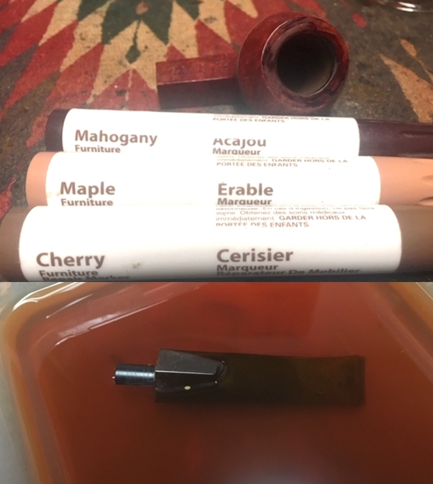 Now comes the hardest part of the process in my opinion. It will either make the pipe look refreshed and beautiful or it will make it look very tacky and poorly done. I mixed three different stain pens and a black Sharpie pen to match to colour of the Bruyere stain. I used a Cherry, Maple and Mahogany stain pen – blending them together rather than letting each one dry. The colour is very close. I set the bowl aside to let the stain dry and put the stem in a bath of Before & After Deoxidizer to soak. That done I turned off the lights and called it a night.
