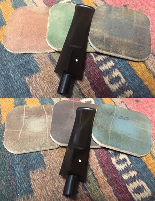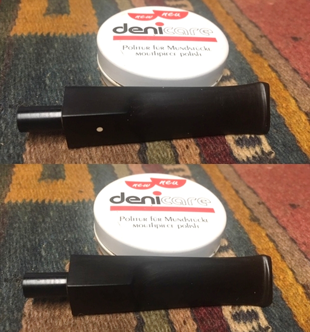 I set the bowl aside and turned my attention to the stem. I also sanded out the tooth marks and chatter on the surface of the vulcanite with a folded piece of 220 grit sandpaper. I followed the 220 grit sandpaper with 400 grit wet dry sandpaper to minimize the scratching. The two papers combined do a great job removing the tooth chatter and remaining oxidation left behind after the stem soak. I polished the stem with Denicare Mouthpiece Polish to take out the oxidation at the button edge and on the end of the mouthpiece. I buffed the stem with a microfiber cloth.