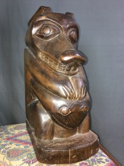 I have included a photo of one of Bob’s wood carvings to give you an idea of what he daughter wrote about above. You can see his artistry in the carving that is patterned after British Columbia’s Coastal First Nations people. To me this is a sea otter but perhaps a reader may enlighten us.