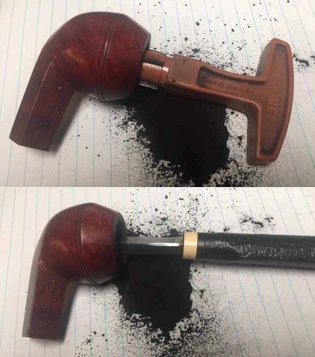 With that in mind I turned to work on this pipe. I reamed the bowl to remove the cake on the walls and the debris of tobacco shards that still remained. I used a PipNet pipe reamer to start the process. I followed that with a Savinelli Fitsall Pipe Knife to clean up the remaining cake in the conical bottom of the bowl. I sanded the bowl with 220 grit sandpaper wrapped around a piece of dowel. It smooths out the walls and also gives a good start to the process of bringing the inner edges back to round.