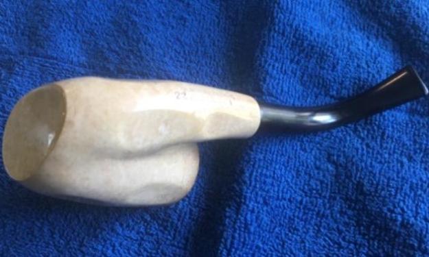 This well made pipe has a beautiful Oom Paul shape with shallow non geometrical concave panels all around. The rim top shows large and evenly serrated surface. The rim top surface appears to have been painted black which has worn out over time. The bottom of the shank is stamped as “GENUINE BLOCK” over “MEERSCHAUM” with #22 on the left, probably the shape code. The underside of the screw-in vulcanite stem surface bears a very faint stamp of “MADE IN TAN…….IA”, could be and logically most likely is, Tanzania!!