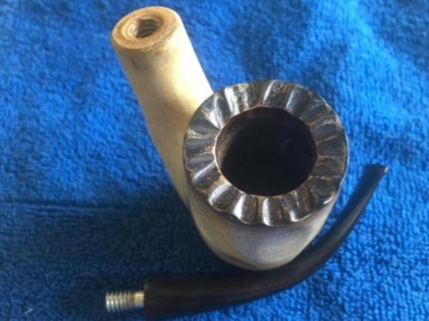 This is virtually an un-smoked pipe with no cake in the chamber. However there are a few scratches on the walls of the chamber. The serrated rim top surface and the rim edges are in pristine condition. The darkened rim top surface points it to have been painted black to provide a contrast with the white of the meerschaum and which over a period of time has been rubbed off. The draught hole is perfectly at the bottom center and should be a great smoker.