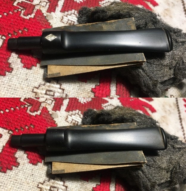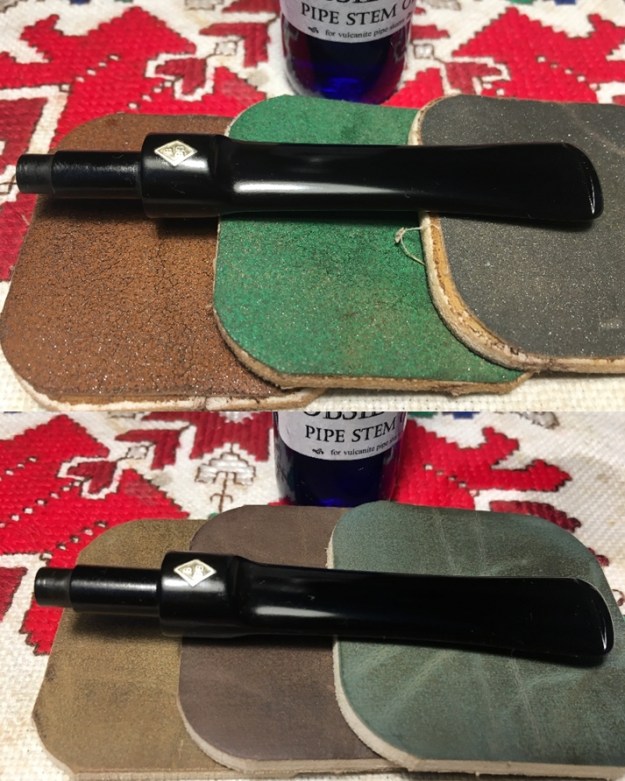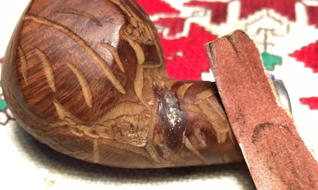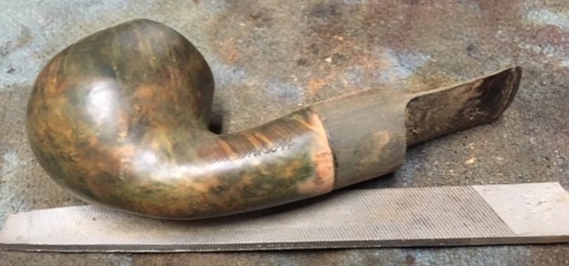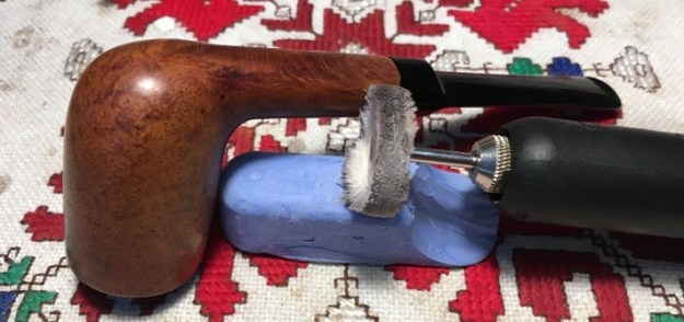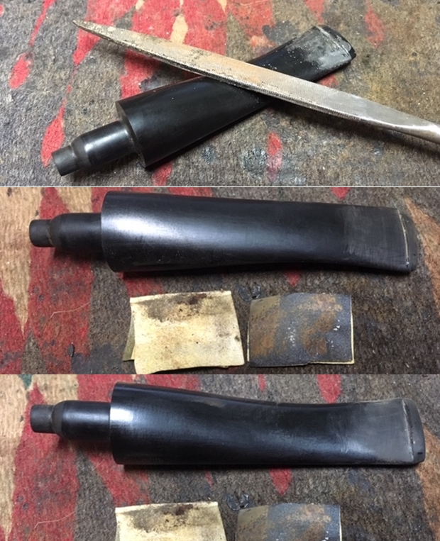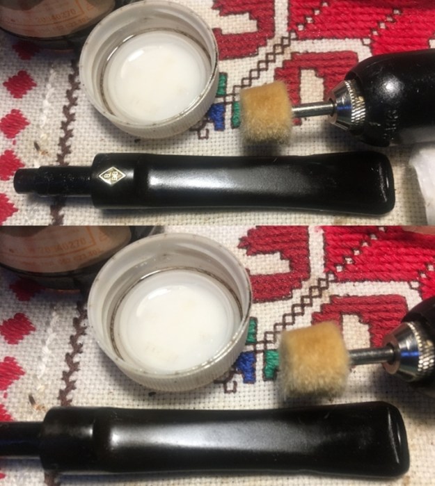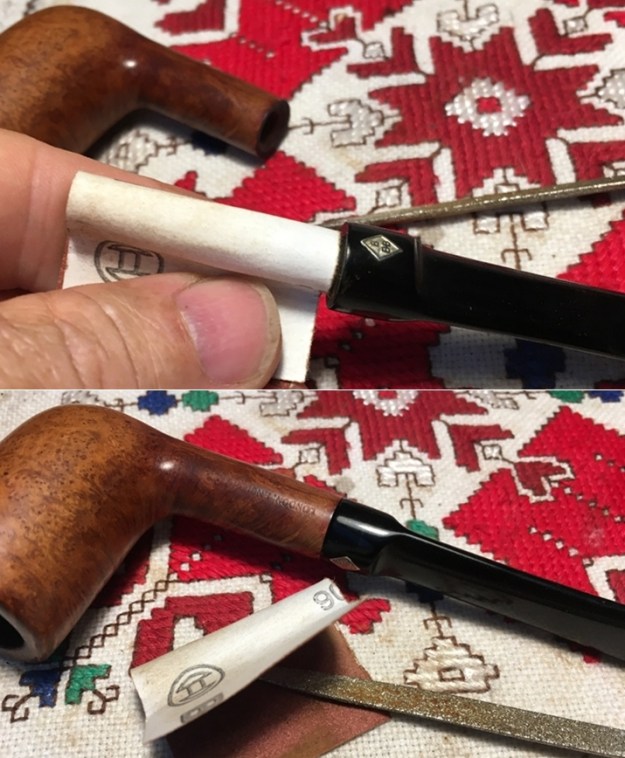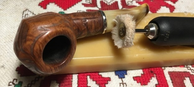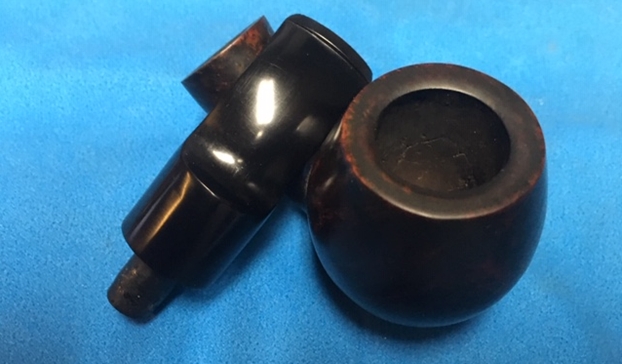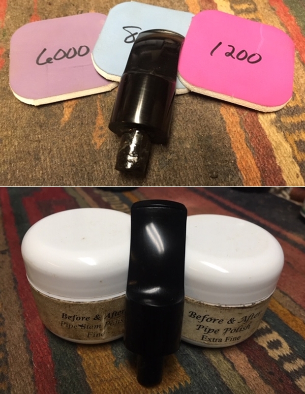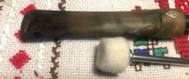 The bowl had the lion’s share of the restoration work needed on this pipe. So with that virtually completed other than the final polishing I set it aside and turned my attention to the stems. I painted the bone push tenon with clear fingernail polish to build it up and tighten the fit in the shank.