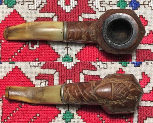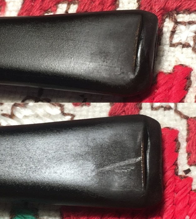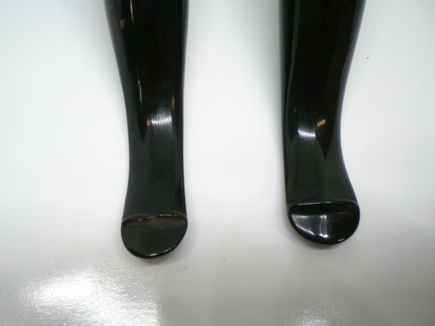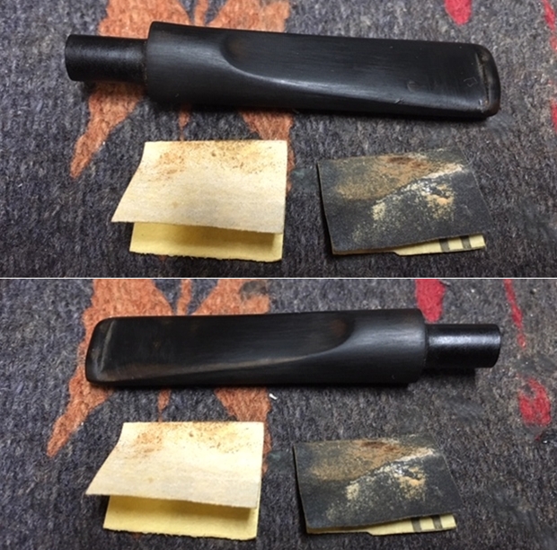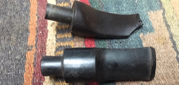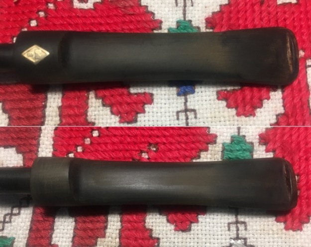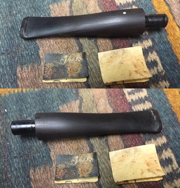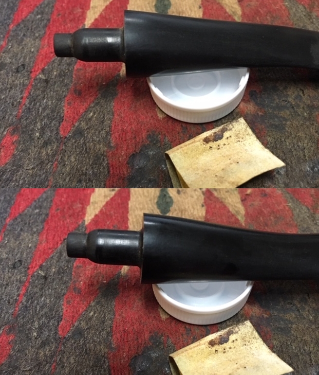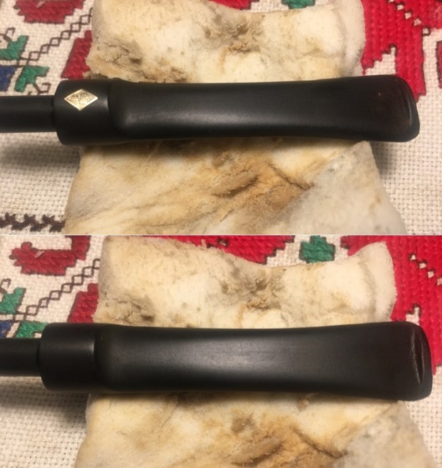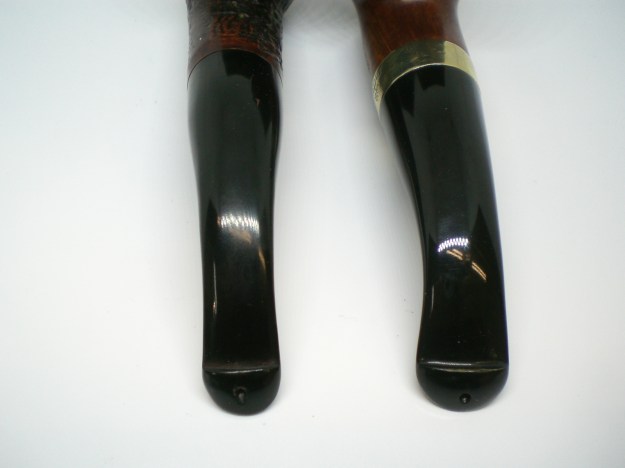 Jeff took photos of the two stems together. There seems to be a variation in length between the two stems. The horn stem has more of a bent and makes it appear to be slightly shorter than the amber one. In reality they are the same length. Jeff also took photos of both sides of each stem to show their condition.