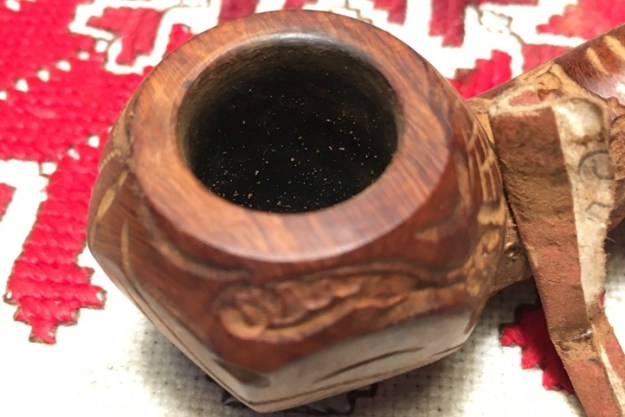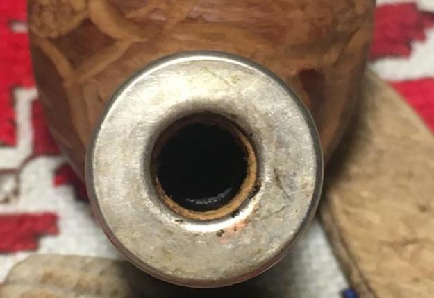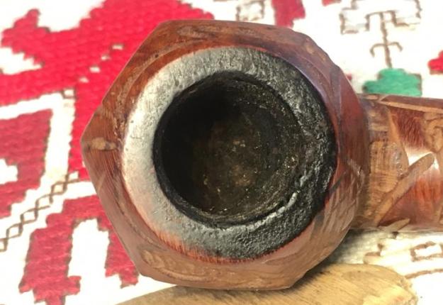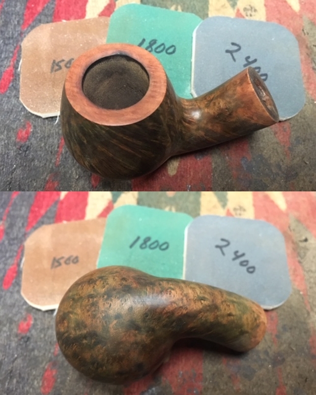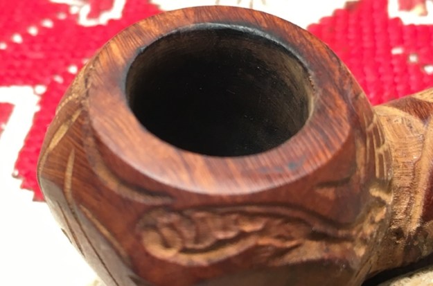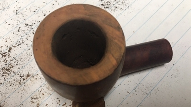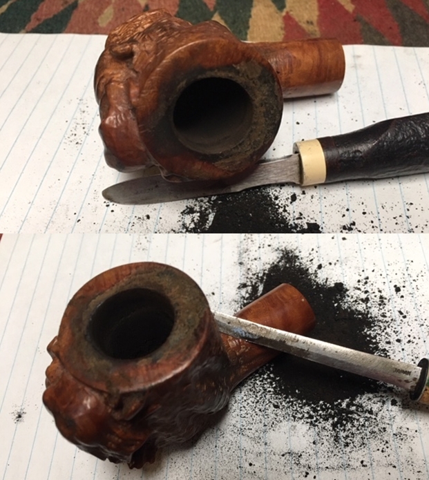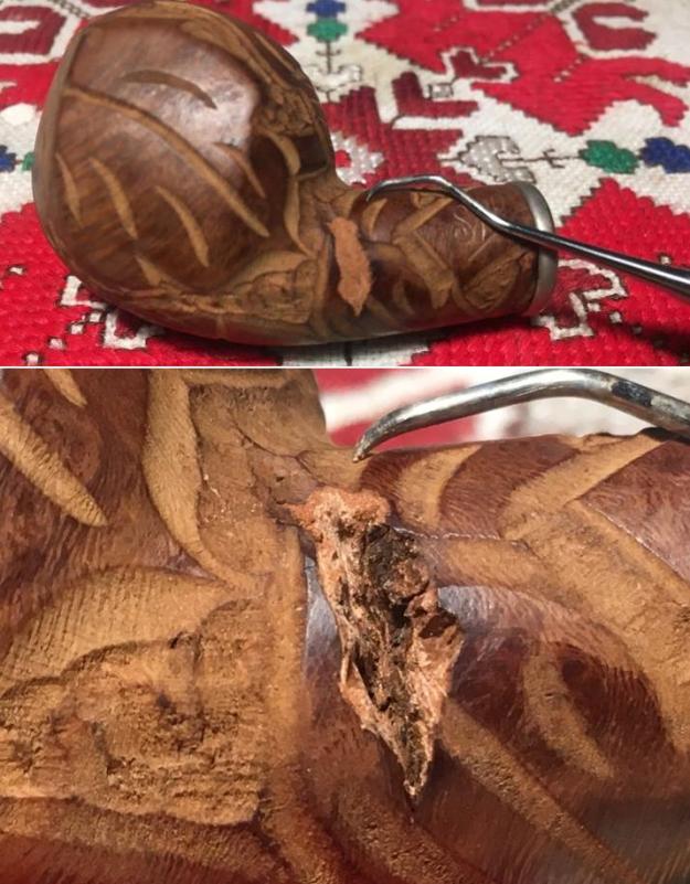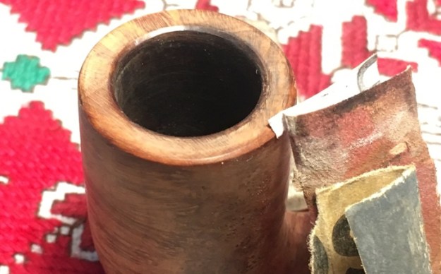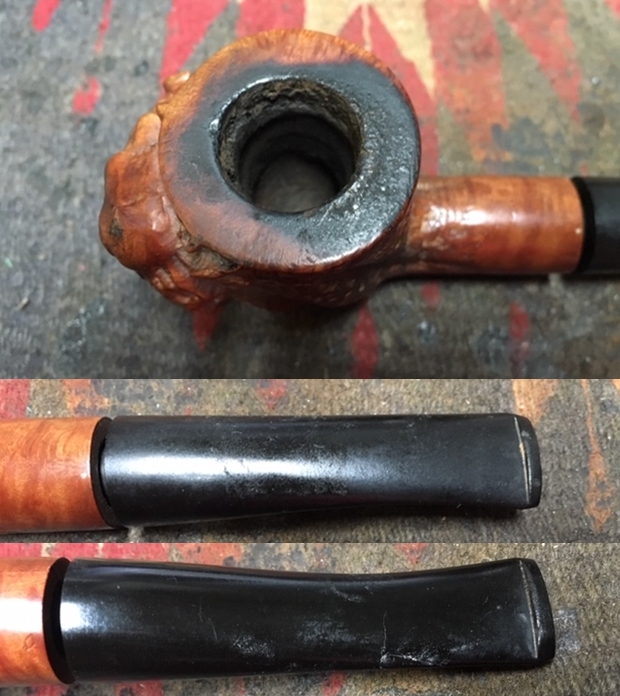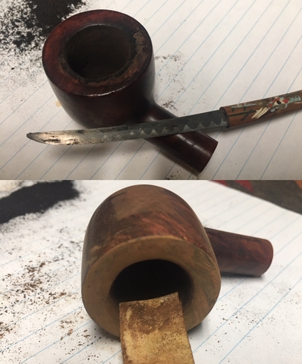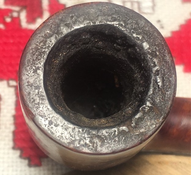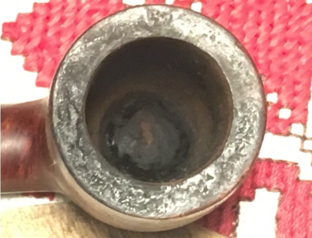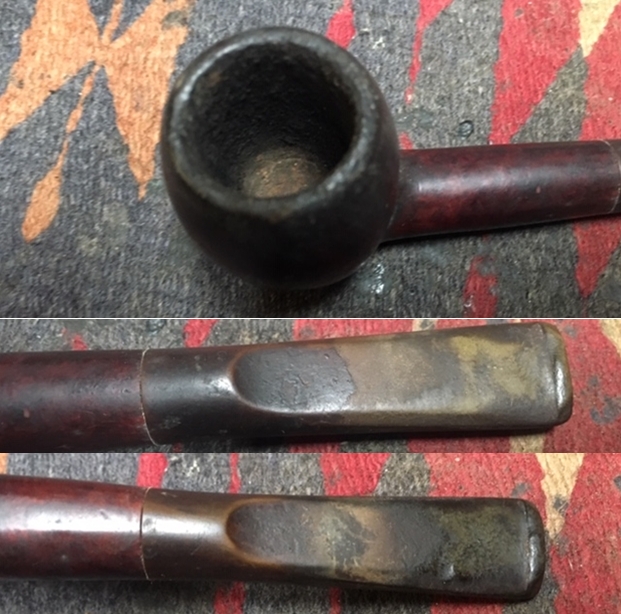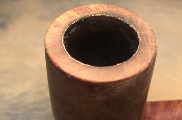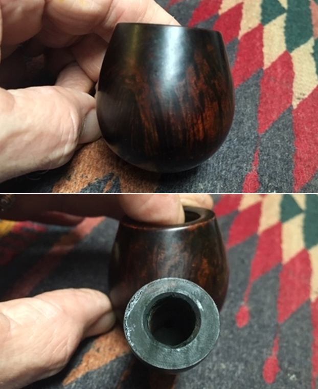 Jeff took a photo of the rim top to show the condition. The photo shows the tarry buildup on the top and the damage to the inner and outer edge of the rim. You can see the cut like marks on the front of the bowl. The thick cake is also visible on the inside of the bowl. The second and third photo shows the grain around the bowl sides. Even under the grime you can see the interesting grain on the bowl sides. There is also a fill very visible on the left side of the bowl toward the rear top.