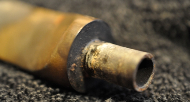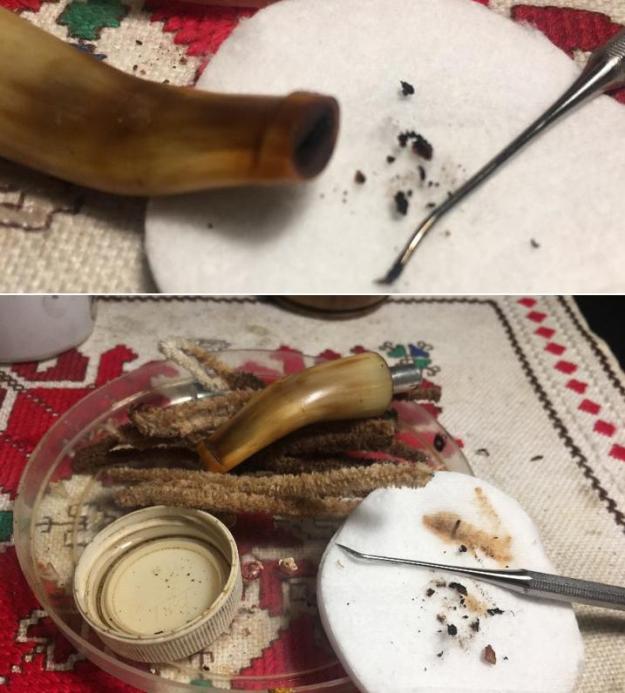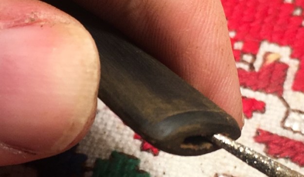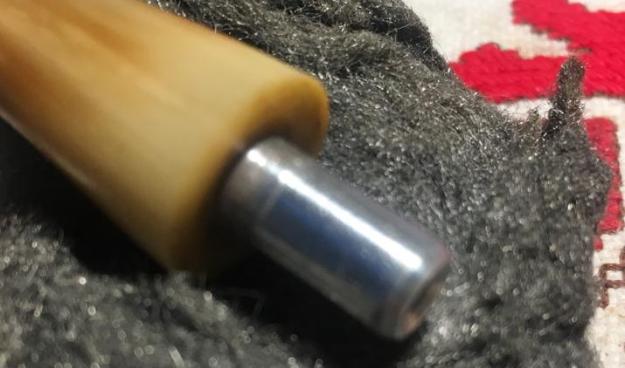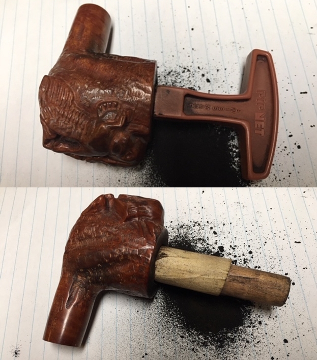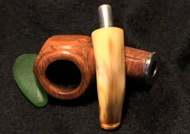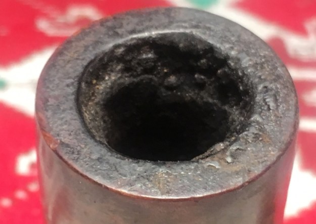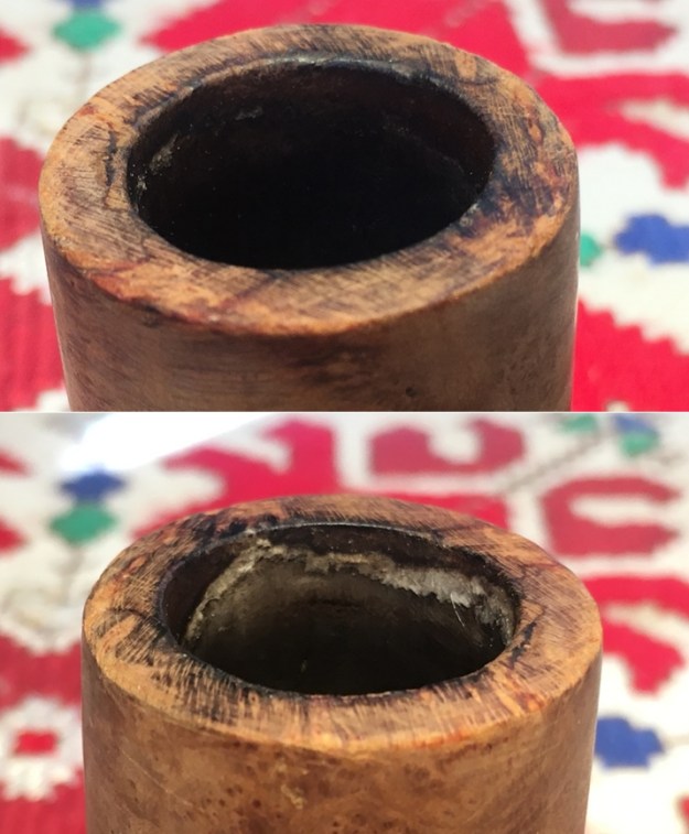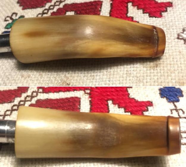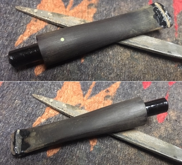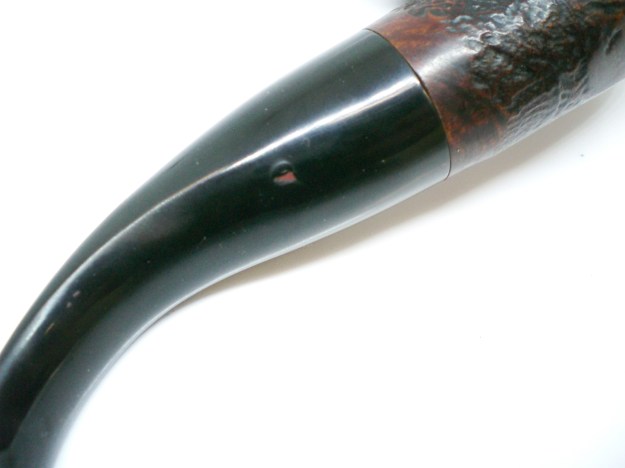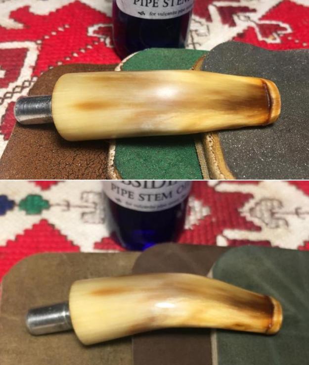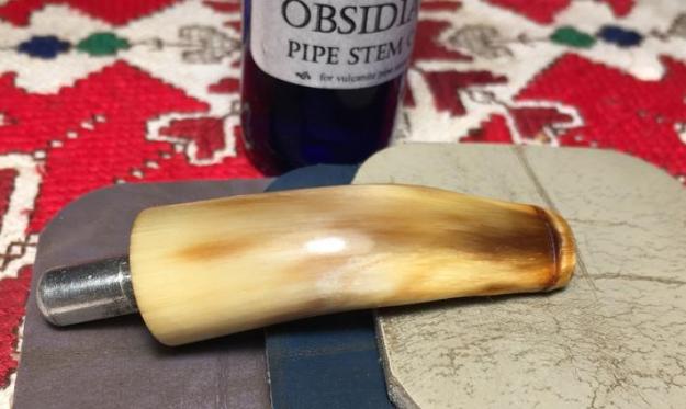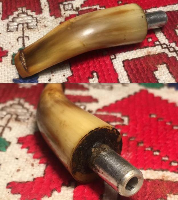 Jeff also took photos of the tenon on each of the stems. Both are bone push tenons rather than the older style threaded bone tenons. The tenon on the amber stem has more of a taper to the end before the nipple. The tenon on the horn stem is more even from the end of the stem to the end of the nipple.