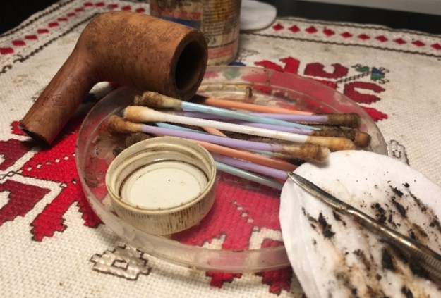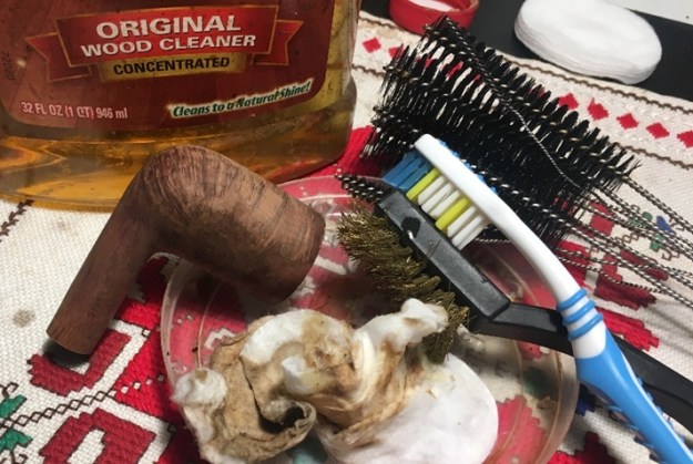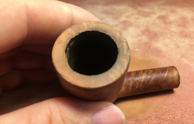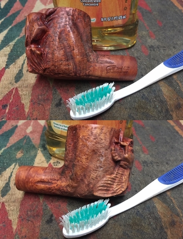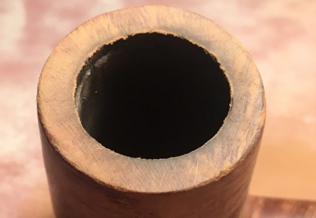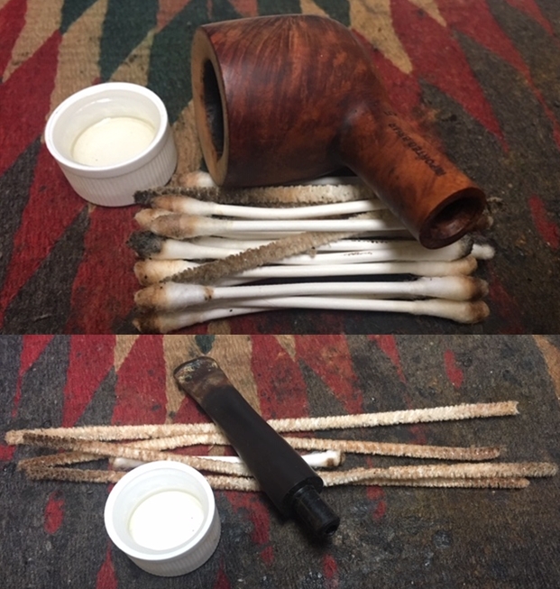 On opening the case I was once more stunned by the beauty of the pipe. It really was a beautiful billiard. The only visible flaw was the fill on the left side of the bowl. The fill had shrunken and was rough to touch. You can see it in the photo below. Other than the damage to the rim top it is a stunning pipe. Jeff did his usual thorough cleanup of the pipe and stems. He cleaned the exterior of the pipe with Murphy’s Oil Soap and a tooth brush. He scrubbed it and rinsed it off with warm water. He scrubbed out the internals with pipe cleaners, cotton swabs and alcohol.
