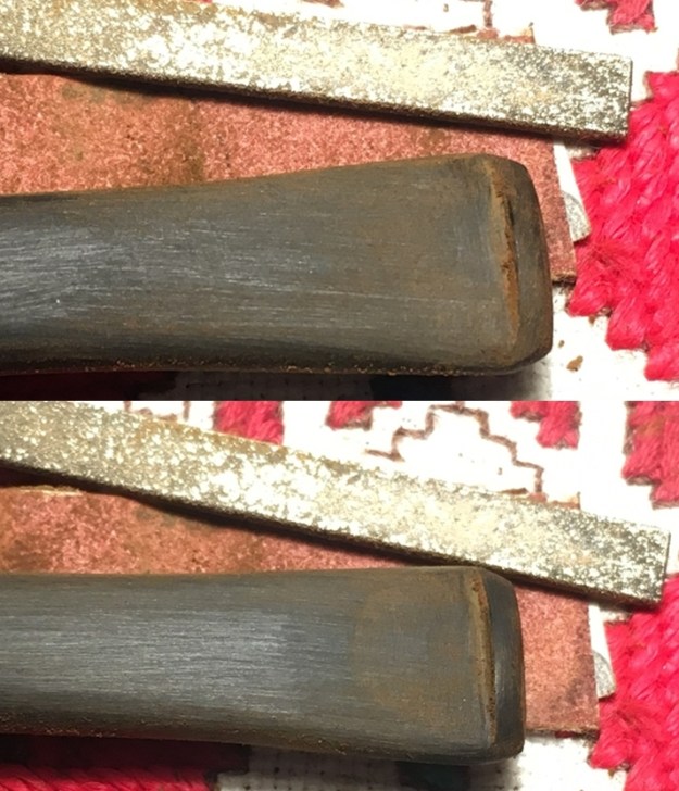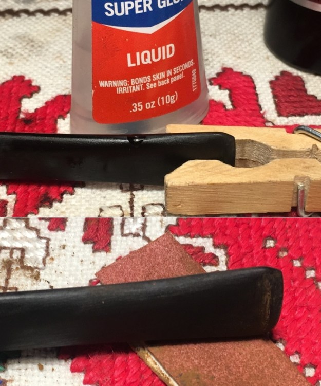 When repairs had cured I sanded them with 220 grit sandpaper and polished it with 400 grit wet dry sandpaper. I sanded and resanded until the surface was smooth. I polished it with 1500-2400 grit micromesh sanding pads. I wiped it down with a damp cloth after each pad.
