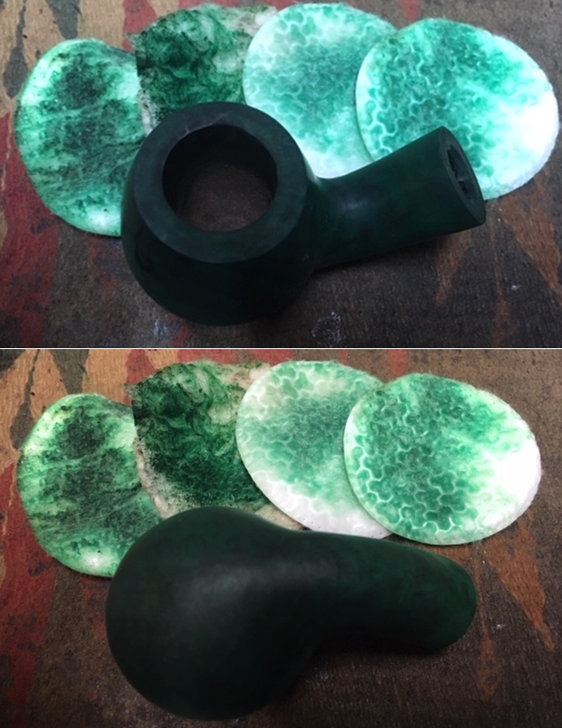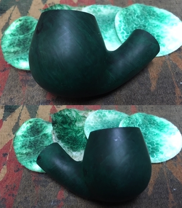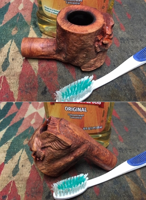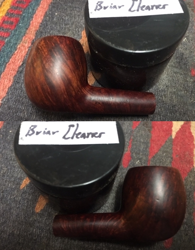 To further blend the stain into the rest of the bowl colour I decided to continue experimenting with a new product from Mark Hoover of Before & After Products. This one is a product he labels briar cleaner and it has the capacity of absorbing grime and dirt from the surface of briar. I rubbed the bowl down with some of his Briar Cleaner to see how it would work in this setting. In speaking to Mark he noted that the product is completely safe to use. The main product is even FDA approved edible. I rubbed it onto the bowl and rim top with my finger tips and worked it into the grime and grit on the bowl. I let it sit on the pipe for about 5 minutes before I rubbed it off with a microfibre cloth. I rinsed it under warm running water to remove the residue. I was pleasantly surprised by how clean the surface on the bowl looked when I was finished.