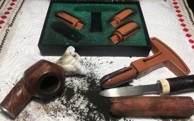 He took the pipe and stems out of the case to show the look of the parts of this old timer. The pipe has some good grain on the sides.