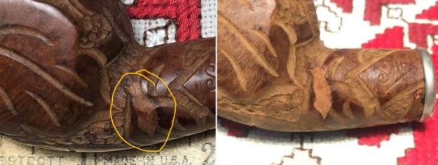 I took a close up photo of the rim top to show the cuts in the rim top on the front outer edge of the bowl. The scratches and cuts were deep. I also took close up photos of the stem surfaces to show their condition.