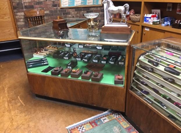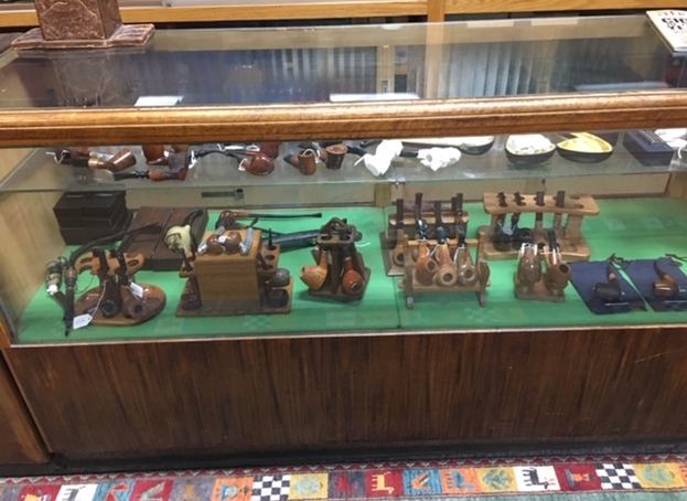 I took some close up photos of the pipe area. The display cases housed both pipes and racks. The first photo shows a variety of boxed pipes of various brands. On the wall behind are humidors and hygrometers and chargers for the humidors. The second photo shows the pipes in a collection of older style pipe racks. All pipes were marked for sale. The third and fourth photo shows the final display at the back corner as well as the pipes on the wall behind the display.