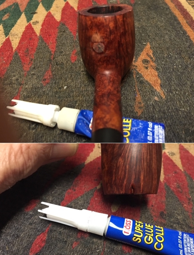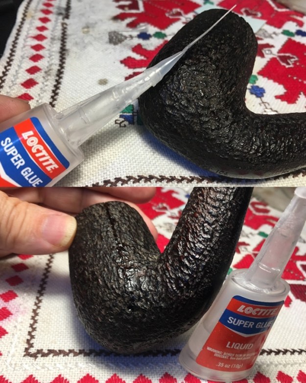 I look closely at the crack repair (formerly the Grand Crack Canyon) and it is solid, but I notice again that the crack line itself and the pipewood in the immediate area running along the crack has lightened a wee bit. It’s not surprising after using acetone to clean away the excess CA glue from the crack repair. The picture shows this well.