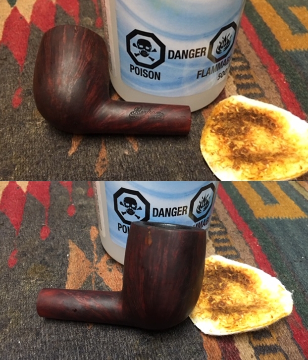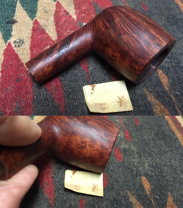 Anxious to see the stem and stummel reunited, I peel away the masking tape and clean the exposed stummel with a cotton pad wetted with alcohol. Not bad!