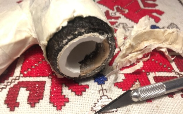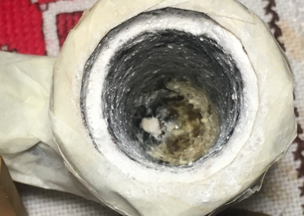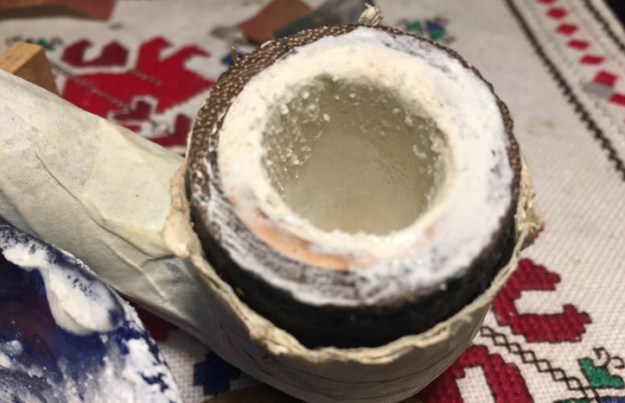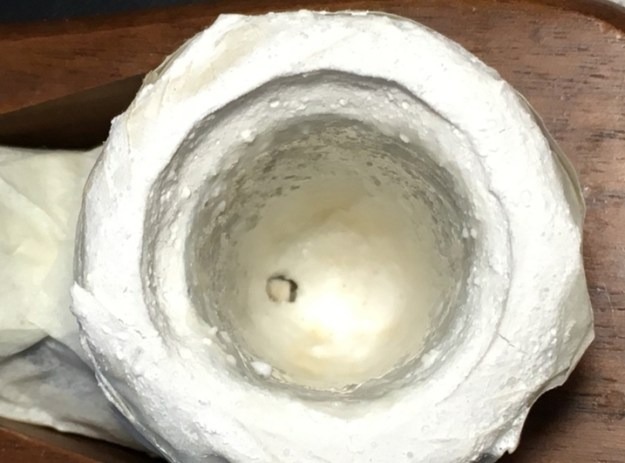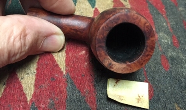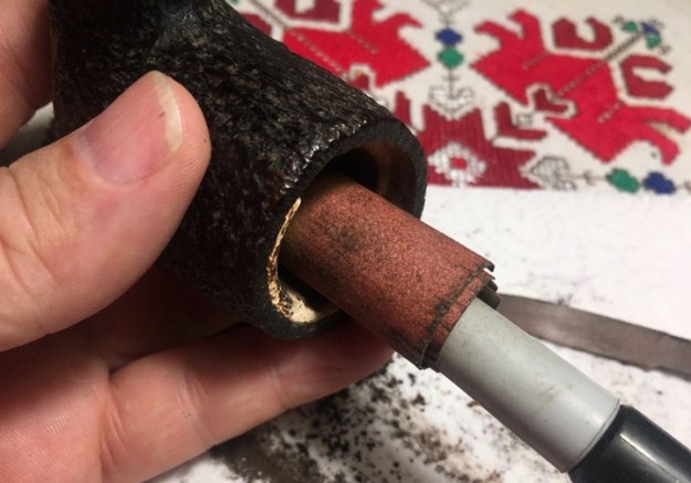Before beginning on the stummel repair, I need to clean the Meerschaum lining to be able to get a closer look at its condition. I see something obstructing the draft hole. After unsuccessfully trying to push a pipe cleaner through the draft hole via the mortise, I take a dental probe and am able to pop it out. It appears to be an old hunk of dottle that had hardened.