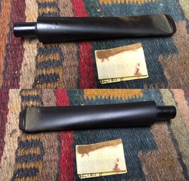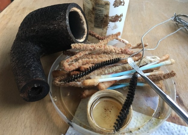 This question prompted me to write Steve with the question regarding how a Meer-lining was installed. Was the Meer-lining a result of compacted or pressed Meerschaum that was formed to the chamber or was it a cut piece of Meerschaum that was inserted as a separate piece? Steve’s response was that Meer-linings generally were cut in a lathe and drilled and inserted to fit the chamber. This information was helpful because it would indicate then that the Meer-lining remaining in this Kilimanjaro was essentially one piece, and barring any large hidden cracks in the surviving Meer, should be structurally intact. I’ll need to clean the surviving Meerschaum lining to make sure that the rest is intact and then begin the repair from the outside working in. With this initial assessment of the serious issues standing in the way, I begin the clean-up by running pipe cleaners dipped in isopropyl 95% through the stem and then into a soak with Before & After Deoxidizer along with other pipes in the queue.