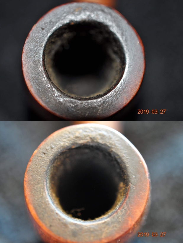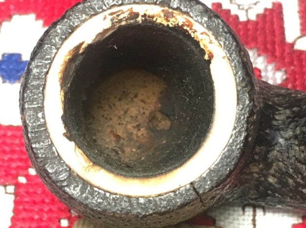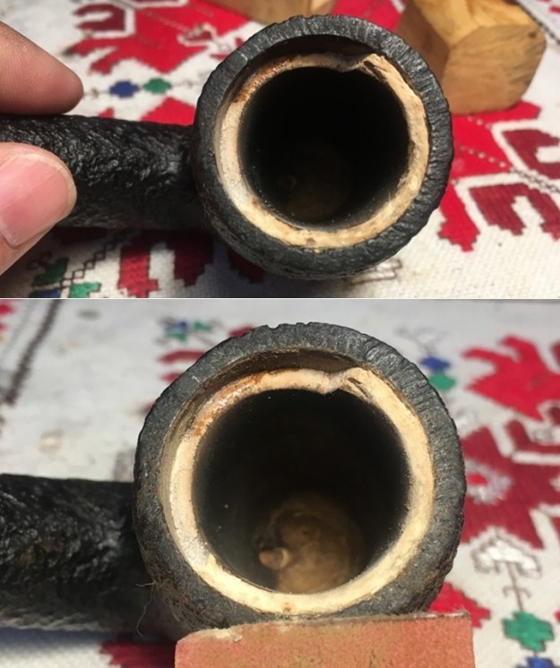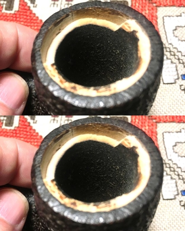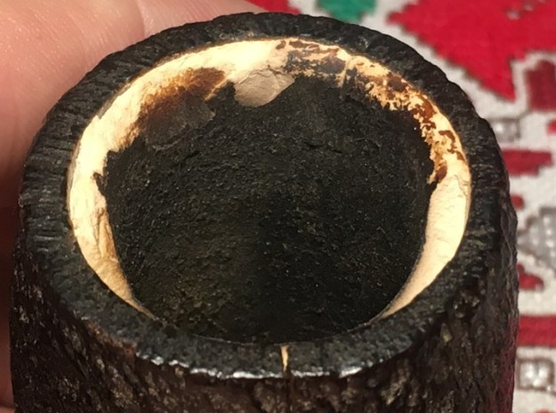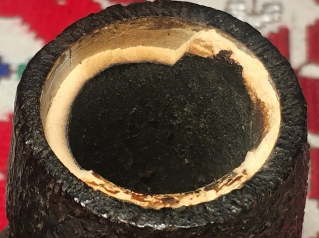 The other major issue is the Meerschaum lining. The trauma, whatever the source was, cracked and broke off the upper part of the Meer-lining. The Meer breakage appears to correlate to the crack-side which would indicate that the crack and the Meer breakage go together. The question that comes to my mind again is, what caused the crack and the breakage? To ‘Sherlock’ the scene shows no trauma to the surrounding pipewood, which I would expect to see if the trauma were caused by a dropping of the pipe. Inspection of the rim leaves me with the impression that it is thin for the size of the pipe. This observation leads me to postulate that the crack was possibly caused by the expansion of the wood as the Meerschaum heated, but how much does Meerschaum expand as it heats? If so, even microscopically, this would suggest that the expansion could have contributed to the pressure on the encasing pipewood contributing to the crack. But what explains the breakage of the Meer? The vertical crack is set almost center between the widest break points of the Meerschaum.