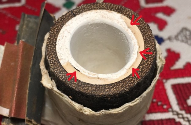 After the topping, I use pieces of 240 then 600 grade papers to further smooth the chamber walls – blending the edges of the differing layers of the Old Timer material. Smoothing the rim more also seems to harden the material more – making both the native Meerschaum lining and the Ole Timer more durable. I also give the inner rim edge a subtle rounding which protects the edge from chipping. Looking closely at where the native Meer and Ole Timer Faux Meer meet, I see a few gaps that the Ole Timer mixture did not close. These are marked with the arrows.