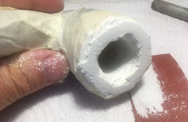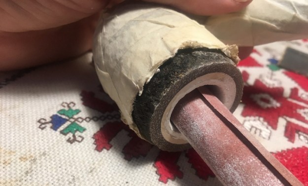 I come to the point of sanding once more. The gradual building of the Ole Timer mix looks good. I use 240 grade paper wrapped around a Sharpie Pen to provide the firm backing to the sanding. I want the chamber straight and I don’t want to inadvertently bevel off the internal edge at the rim.