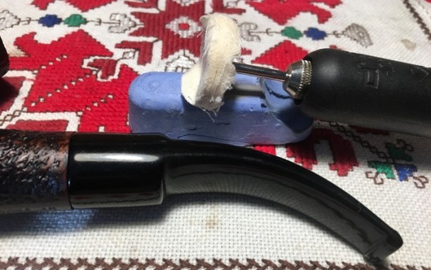After reattaching the stem, I mount the Dremel with a cotton cloth buffing wheel and set the speed at 40% full power. I then apply Blue Diamond compound to the stem. I also apply the compound to the rim surface as well as the smooth surface on the underside of the shank holding the nomenclature.