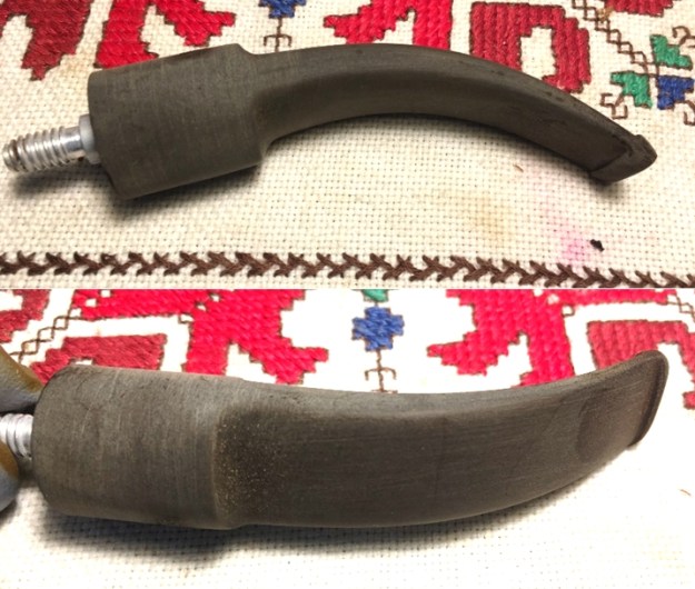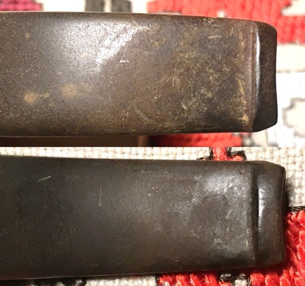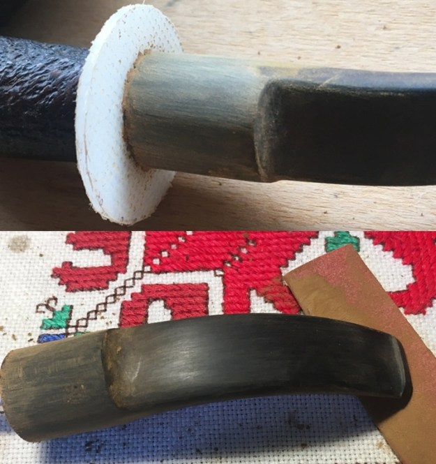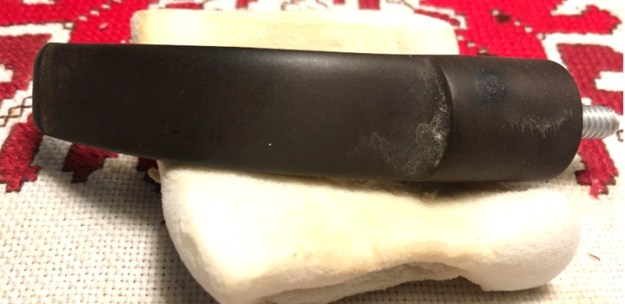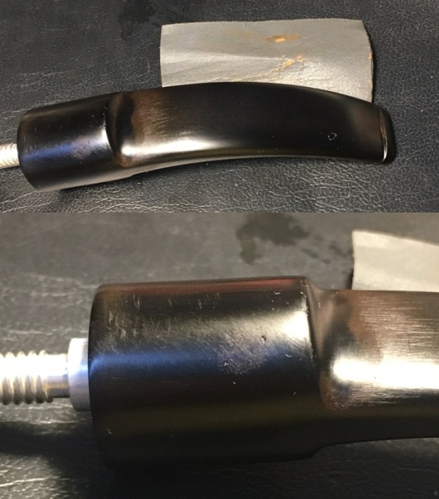I return to sanding with 240 grade paper on the areas that continue to show oxidation and then finally move on to wet sanding with 600 grade paper and then apply 000 steel wool. I also use Mr. Clean Magic Eraser to clean further. The stem is much improved even though the ‘wart’ is still visible.