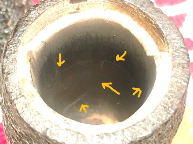 The mysterious ‘pipewood’ continues to dog me. What is pipewood anyway? I did a bit of snooping in my research bucket and remembered that Charles Lemon had worked on a Kilimanjaro (see: Resurrecting a Giant Kilimanjaro War Club Billiard) and he had raised the same question about the type of wood he was working on – definitely not briar. In the comments section of that blog we went back and forth about the wood and Johan came up with the mysterious ‘Pipewood’ designation in Pipedia’s article which I referenced above. Charles didn’t resolve what ‘pipewood’ actually was either. I decided to ask my wife what she made of this ‘East African Pipewood’. She’s pretty amazing with plants and is a horticulturalist hobbiest in her own right. She looked at the grain I had uncovered on the rim and with little thought observed that that it looked like bamboo. With her curiosity piqued, she did a bit of online research and sent me a link with a picture (see LINK) labeled, ‘bamboo end grain flooring’. The cheetah-like spotting is very much like the Kilimanjaro’s rim. Then, a little later, as if to produce exhibit “2”, my wife handed me one of our throw-away bamboo chopsticks we get from our favorite Bulgarian Chinese home delivery restaurant. I managed to take a closely focused picture again to show the uniformed ‘tubular’ grain structure of a bamboo specimen. The case for East African Pipewood being some strain of bamboo is looking pretty strong. As Charles remarked in his blog noted above, whatever the wood is, it would not be good to use in direct contact with fire, like with briar, but would of necessity need to be paired with a Meershaum lining to work. Thanks to my gifted wife, I think I have a better handle on what pipewood actually is. What I’m seeing on the rim is a cross-section cut of this wood. The LONG crack down the side of the stummel makes more sense with the straightness of it – this wood it structured in long, straight grains. It would not, therefore, have a lot of resistance to an expansion from heating… it would seem! Curiosity satisfied, I move on.