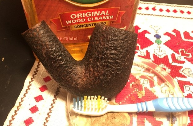 With the stummel crack now stabilized, and before working on the Meerschaum lining patch project, I continue with the normal cleaning regimen. I would rather finish with a clean pipe and not have to clean it at the end! The stummel surface is dirty and grimy. Now that the crack is repaired, I’m looking at the stummel surface and I see hints of oxblood coloring. Using undiluted Murphy, I scrub the blasted surface with a bristled toothbrush. I scrub well getting into the crags of the blasting.