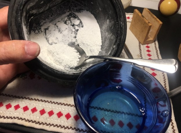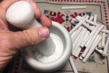 With the Zulu repair I found some chalk from a Kindergarten teacher (of course) who is a fellow team member here in Bulgaria. I used the old-fashioned way of pulverizing the chalk as finely as I could with the mortar and pestle to do the job.