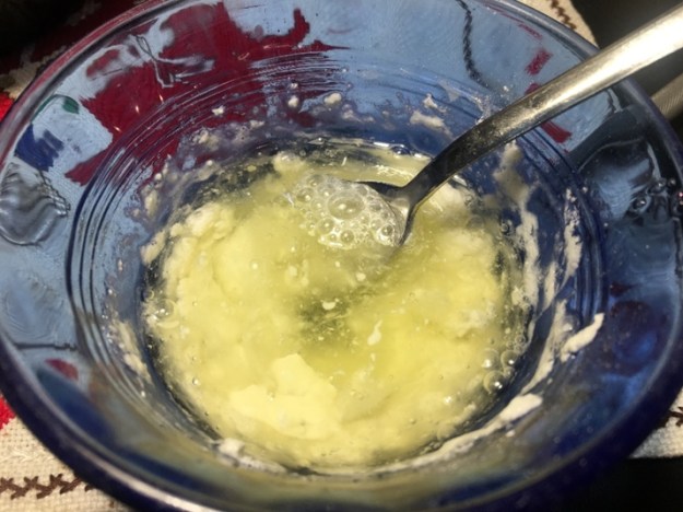 After putting a pipe cleaner in the airway and through the draft hole to keep it free of ‘Ole Timer’ mixture, I apply an initial thin coating of the mixture using my finger to fill in the cracks in the fire chamber and over the broken area at the rim – filling the gaps and cracks is important at the beginning. Later after this first, thin coat sets, I will build up the lining toward the rim so that it will cover the cracks as well as provide a uniform surface as I build out the rim breakage. For the first application, I mix 1 egg white to about 3 tablespoons of chalk to create the initial mixture to get into and fill the cracks for the first two applications. I save the remaining mixture and put it in the fridge and put the stummel aside for several hours for the ‘Ole Timer’ mixture to set. The key to Troy’s approach, I believe, is the patient layering of the mixture allowing it to set and build, layer by layer – not putting the mixture on too thick which I believe would be more prone to trapping air pockets and cracking. The pictures show the process.