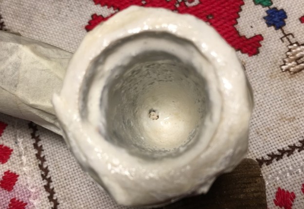 Suffice it to say, I did several more coatings using the Old Timer mixture to build up the rim – I’m passing on more pictures of this process! My goal was to build out the chamber wall to the rim and to fill out the rim, including the breakage gap, so that the chamber is a uniform cylinder. From this reestablished uniform platform, I will then sand back to the original Meerschaum wall and reshape the rim to hopefully mask the breakage and produce an attractive rim presentation of darker pipewood meeting the new reinforced and repaired lining. That “meeting” to me is what makes Meer-lined pipes attractive – the contrasting themes of color and texture. The picture is the final after curing through the night to fully dry and harden.