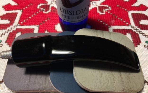 With the stummel on the side again, I turn to the stem and apply the full regimen of nine micromesh pads. I begin by wet sanding with pads 1500 to 2400, then dry sand with pads 3200 to 4000 and 6000 to 12000. Between each set of three pads, I apply a coat of Obsidian Oil to continue rejuvenating the vulcanite stem. It looks good!