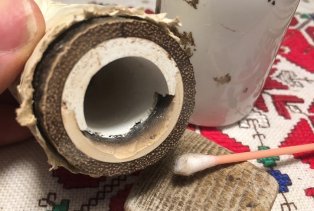 After several hours in the soak, I extract the Kilimanjaro’s stem and run pipe cleaners dipped in isopropyl 95% to clear the Deoxidizer from the airway. I then wipe the stem down with cotton pads wetted with alcohol to remove the raised oxidation. I missed taking pictures of this part, but the aftermath shows residual oxidation in the stem after the Before & After Deoxidizer soak.