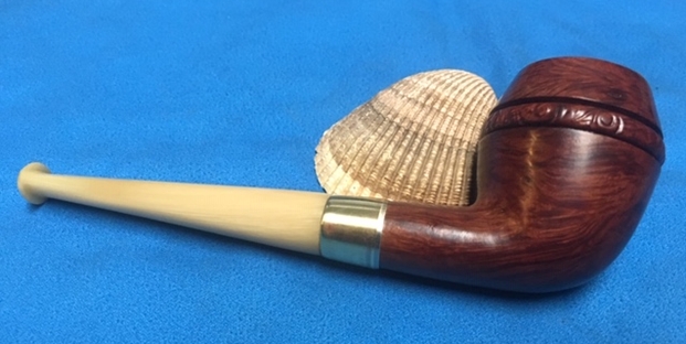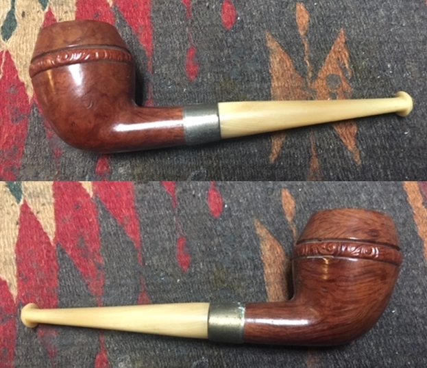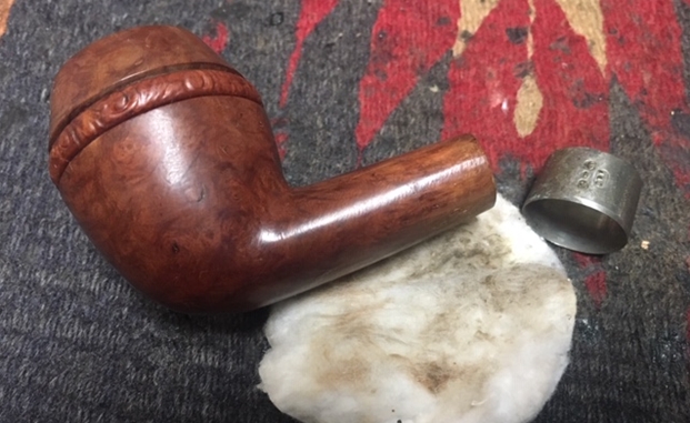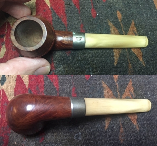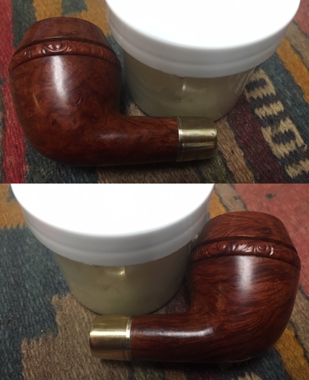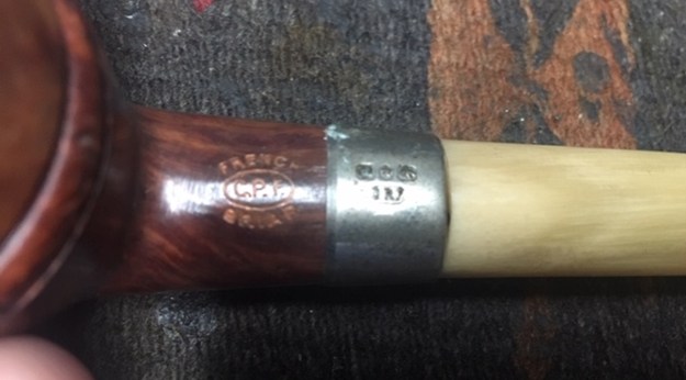 The next photo shows the stamping on the shank and the band. It is clear and readable. The stamping reads as noted above. The hallmarks are the now familiar faux hallmarks that I have found on all banded C.P.F. pipes.