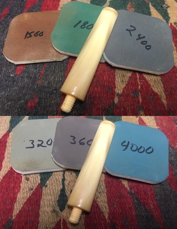 I sanded the stem with a folded piece of 220 grit sandpaper to remove the scratches in the surface of the horn. I polished out the scratches with 400 grit wet dry sandpaper and wiped the stem down with Obsidian Oil.