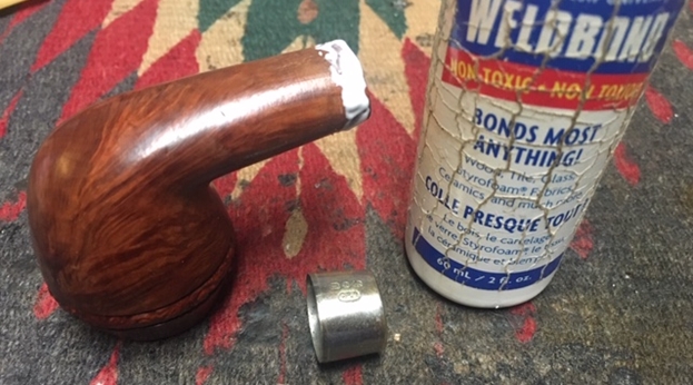 Once the shank and bowl were cleaned it was time to reglue the band. I coated the end of the shank with Weldbond white glue. I spread it on the shank with a tooth pick. I spread it around and make it even. I pressed the band into place on the shank and wiped away the excess glue that squeezed out from under the band. I wiped it down with a cotton pad and alcohol to make sure it was clean. I set it aside to let the glue cure.