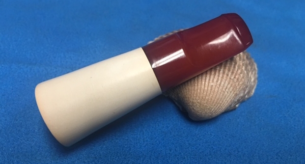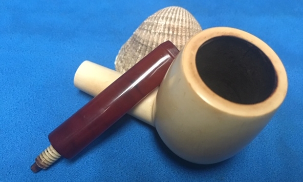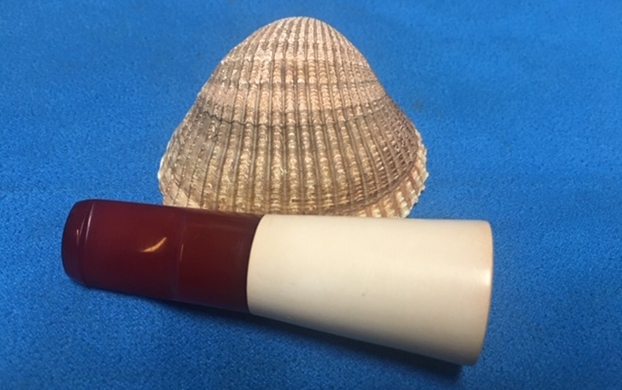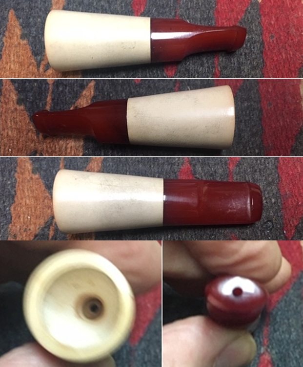 I finished the first pipe in the cased set of meerschaum pipes and holders made by Aristocrat (https://rebornpipes.com/2019/07/21/restoring-an-old-cased-set-of-aristocrat-meerschaums-part-1/). This set included a straight billiard, a bent billiard a cigar holder and a broken cigarette holder. All were smooth meerschaum with red Bakelite or Redmanol stems. All had bone tenons directly screwed into threaded mortises in the meerschaum. There was no stamping on the pipes and holders or the stems. The box itself was covered in what looked like alligator skin with brass hinges and clasps. On the inside the case was lined in an off white preformed velveteen fabric. There was a corner ribbon across the left side of the lid that read Aristocrat. The straight billiard had been smoked pretty heavily and there was a cake in the bowl and the rim top had a thick lava coat. The exterior of the bowl was dirty. The stem had tooth marks and chatter on both sides near the button. The second pipe – the bent billiard was unsmoked but dirty with dust and debris of time. The cigar holder had been lightly smoked and there were tooth marks and chatter on in near the button. The cigarette holder was broken and two parts and the stem remained. There was a missing piece from the front of the holder. It was unused and broken. I took photos of the case and the pipes and holders before I started my work on it. Now it is time to work on the cigar holder.