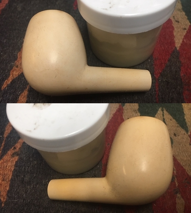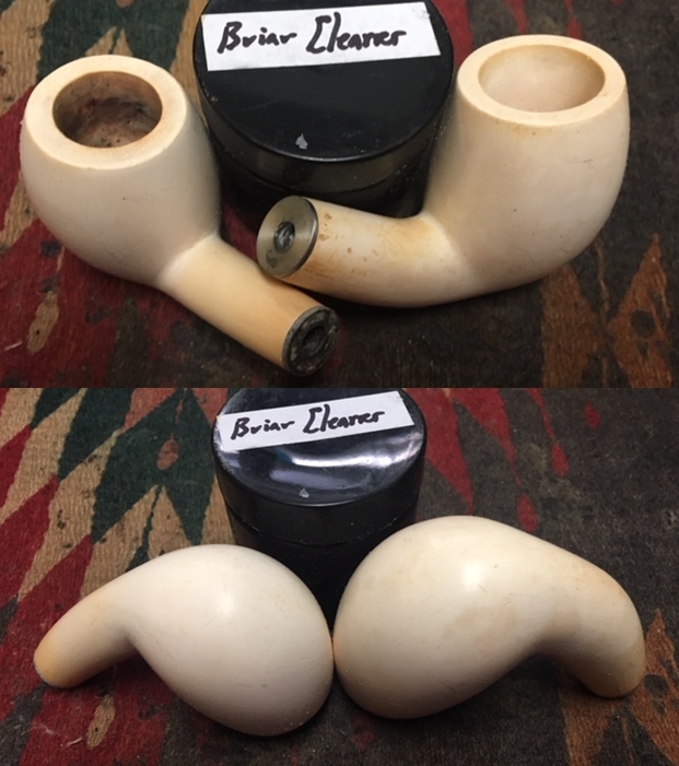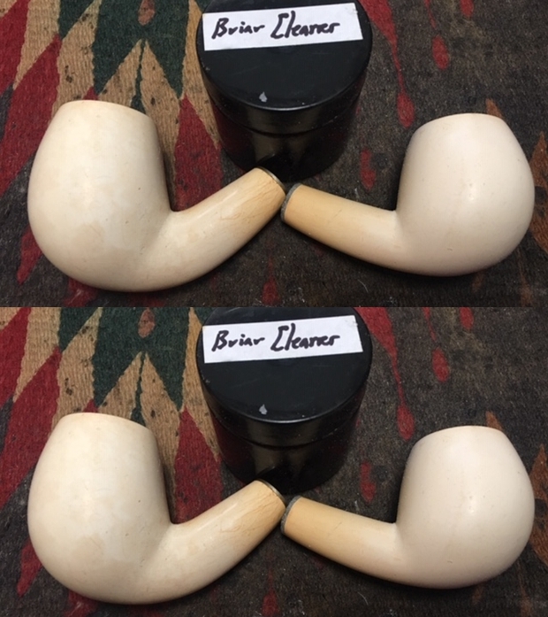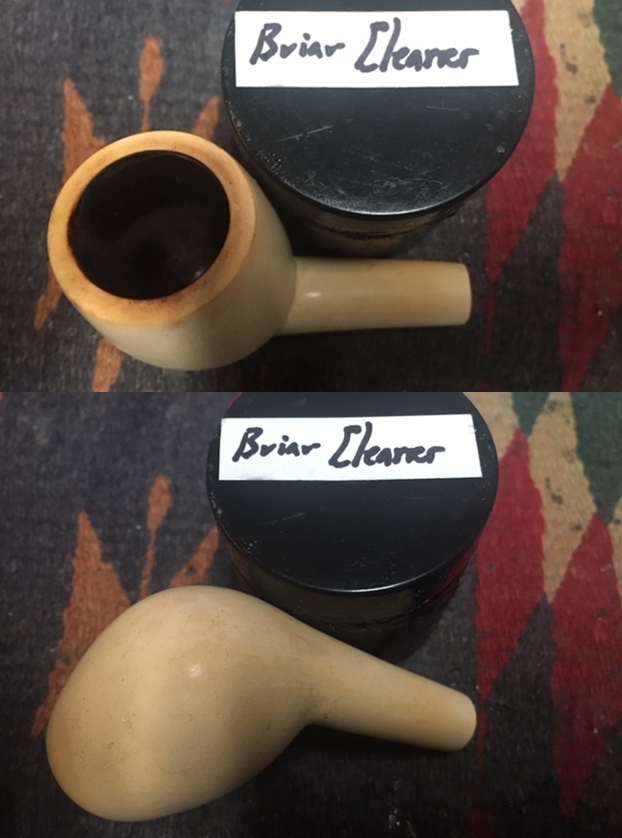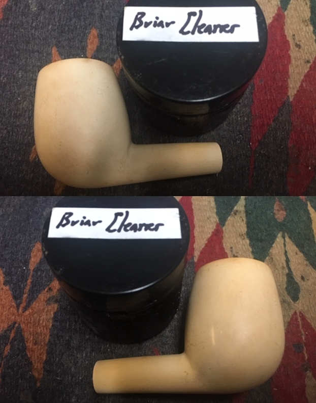 Given the information that I have in hand, I decided to start the restoration work on the cigar holder as it was the second piece in the set that had been smoked. I decided to continue experimenting with a new product from Mark Hoover of Before & After Products. This one is a product he labels briar cleaner and it has the capacity of absorbing grime and dirt from the surface of briar. I decided to try it out set of meerschaum pipes and holders. I rubbed the meerschaum tip down with some of his Briar Cleaner to see how it would work in this setting. In speaking to Mark he noted that the product is completely safe to use. The main product is even FDA approved edible. I rubbed it onto the bowl and rim top with my finger tips and worked it into the grime and grit on the bowl. I let it sit on the pipe for about 5 minutes before I rubbed it off with a microfibre cloth. I rinsed it under warm running water to remove the residue. I was pleasantly surprised by how clean the surface on the bowl looked when I was finished.